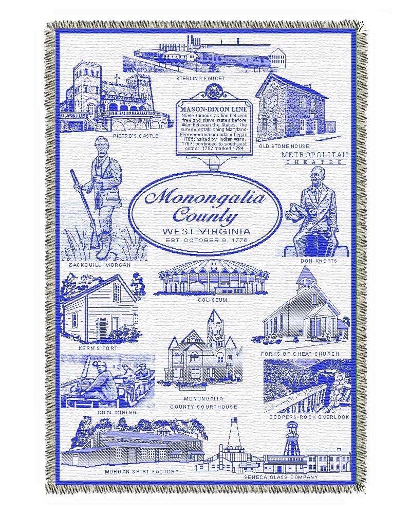 GFWC Mountaineer Woman’s Club: Green and white lap throws 45×60 Contains 12 images of sites and memories in Monongalia County Specifically designed by and for our club. 100% cotton Made in America